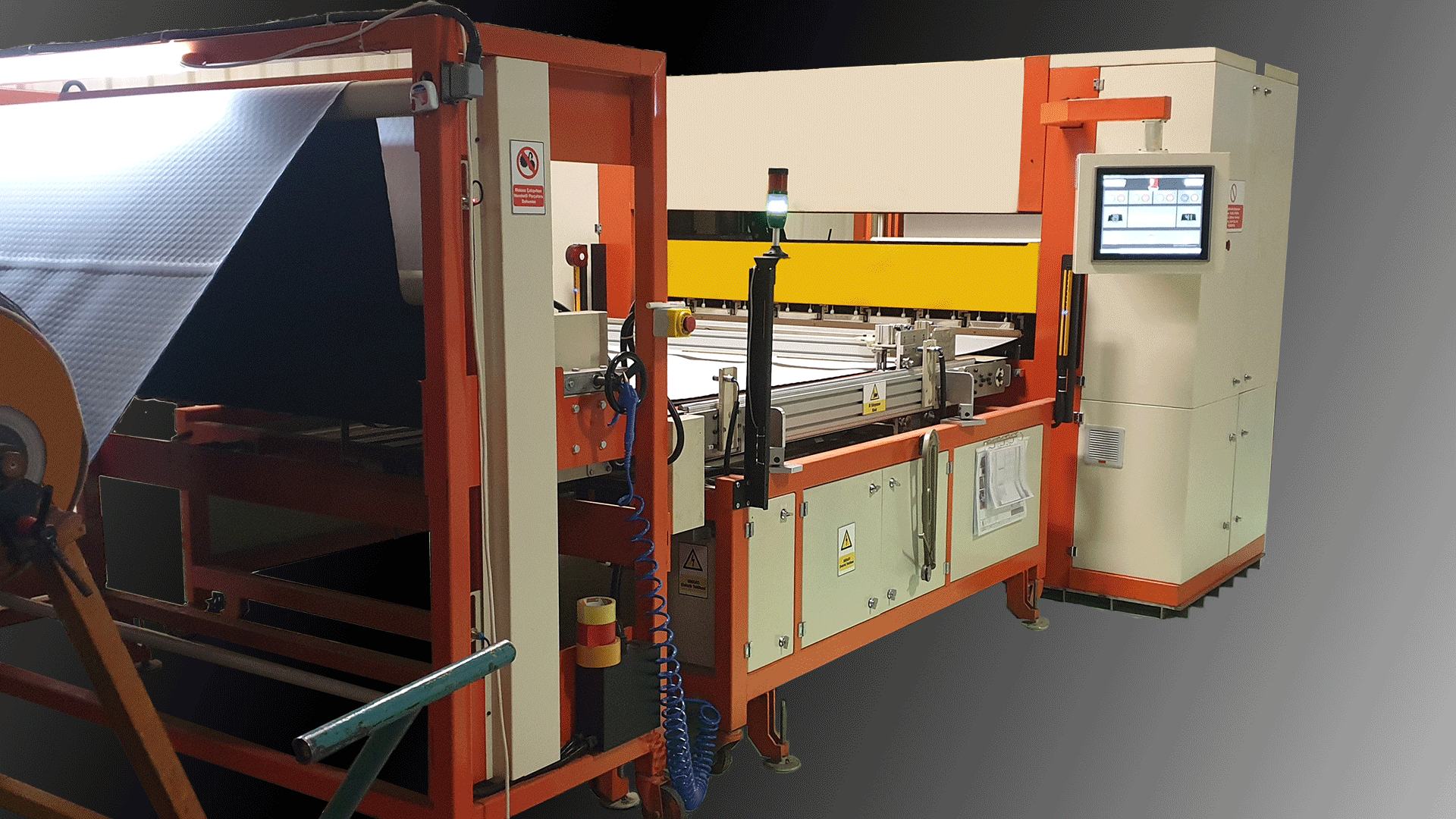 Bu üretim hattı kolay kurulum ve taşıma için modüler olarak tasarlanmıştır. Bu modüller sırasıyla dog hizalayıcı, kumaş besleme ünitesi, sıcak pres ünitesi, çıkış kenar kesme ve sarma ünitesidir.